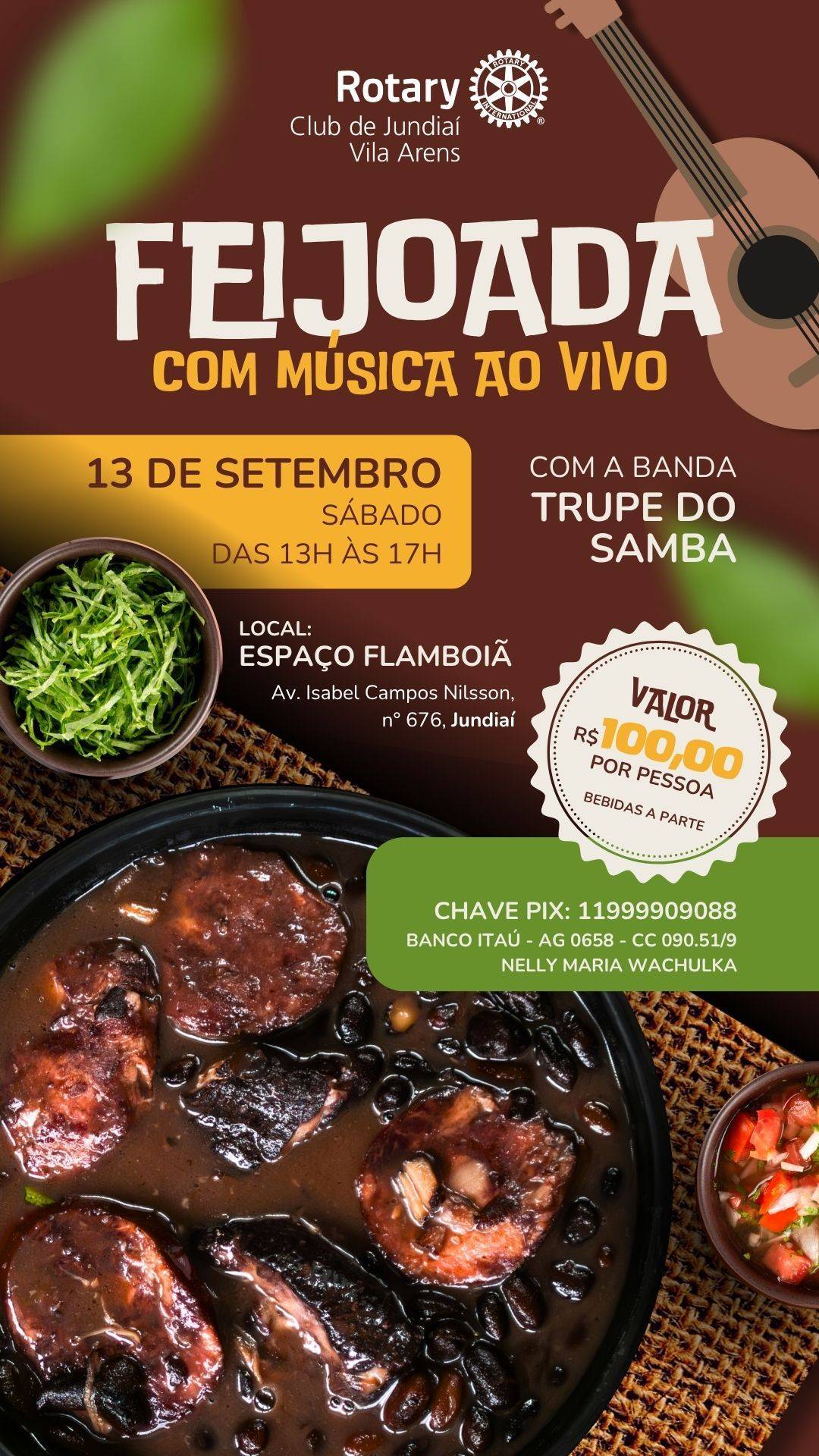 O Rotary Club de Jundiaí Vila Arens promove mais uma edição da tradicional Feijoada Beneficente, evento que alia solidariedade e confraternização. Toda a renda arrecadada será revertida para a Fundação Rotária, entidade que viabiliza projetos de impacto voltados à comunidade jundiaiense.