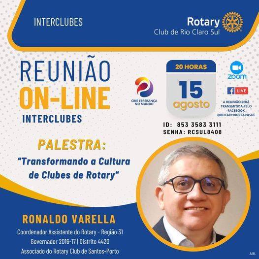 ROTARY CLUB DE RIO CLARO SUL CONVIDA PARA REUNIÃO VIA ZOOM