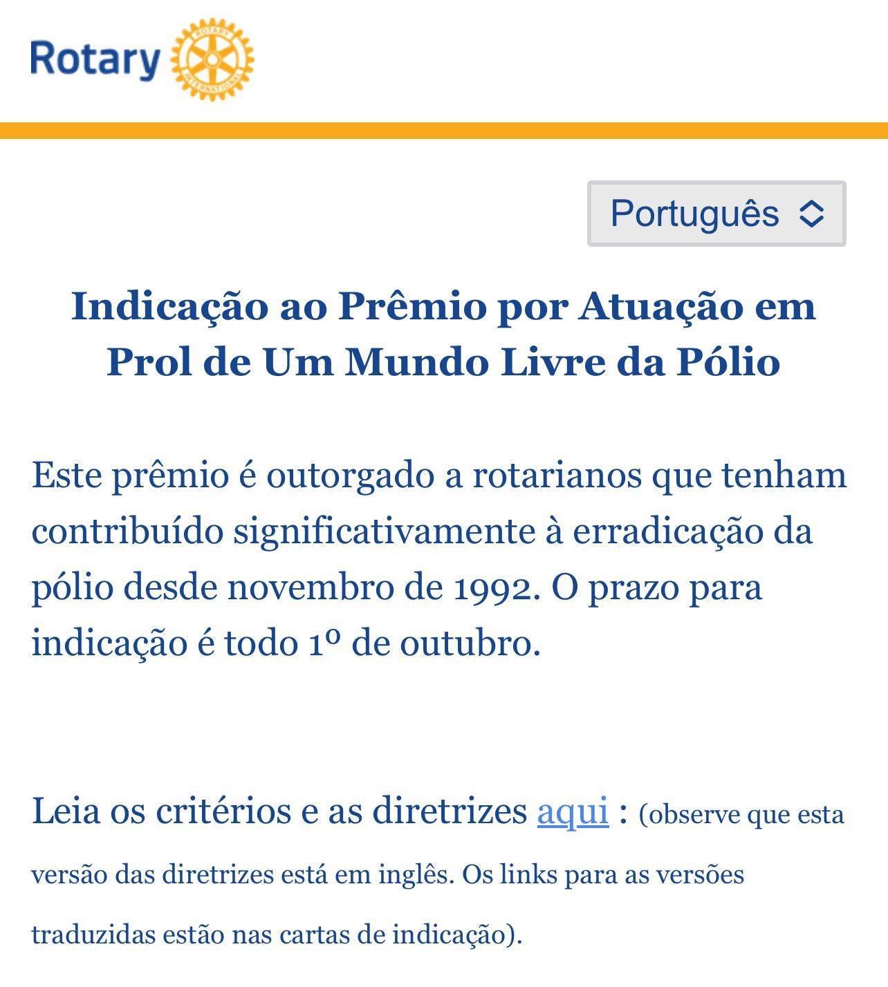 Este prêmio é outorgado a rotarianos que tenham contribuído significativamente à erradicação da pólio desde novembro de 1992. O prazo para indicação é todo 1º de outubro.