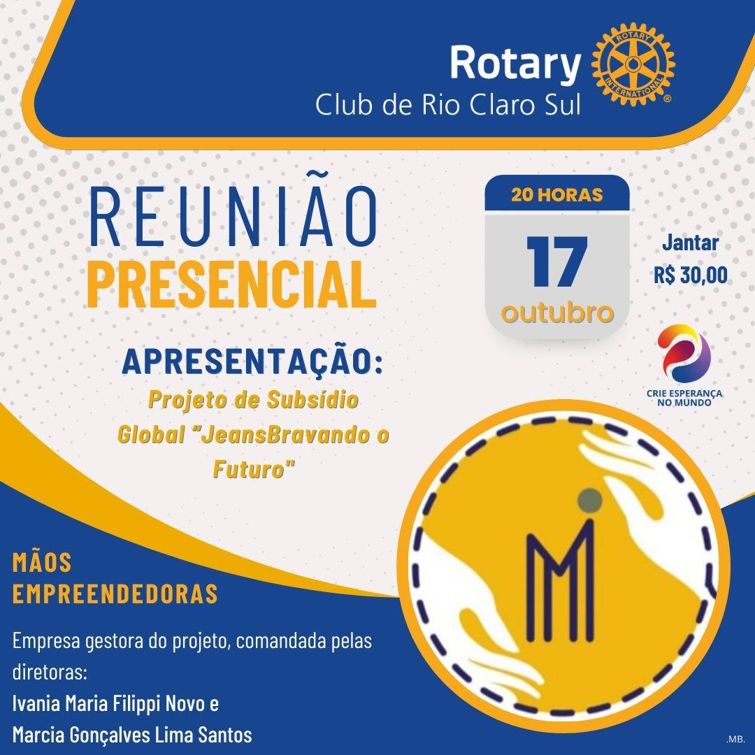 ROTARY CLUB DE RIO CLARO SUL em Reunião Presencial Especial para APRESENTAÇÃO do Projeto de SUBSÍDIO GLOBAL voltado ao EMPODERAMENTO DE MENINAS: JeansBravando o Futuro
