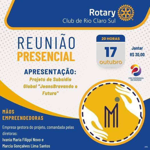 ROTARY CLUB DE RIO CLARO SUL em Reunião Presencial Especial para APRESENTAÇÂO do Projeto de SUBSÍDIO GLOBAL voltado ao EMPODERAMENTO DE MENINAS: JeansBravando o Futuro