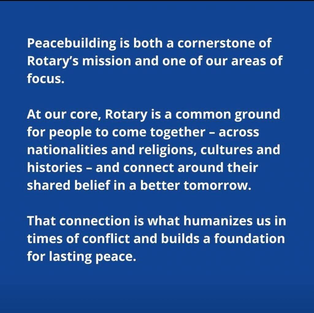 • A consolidação da paz é um pilar da Missão do Rotary e uma das nossas áreas de enfoque. No seu âmago, o Rotary é um terreno neutro onde as pessoas se unem – independentemente de nacionalidade, religião, cultura ou histórico – e formam conexões em torno do seu desejo compartilhado de um futuro melhor. Esta conexão é o que nos humaniza em momentos turbulentos e serve de alicerce à paz duradoura.