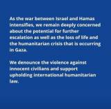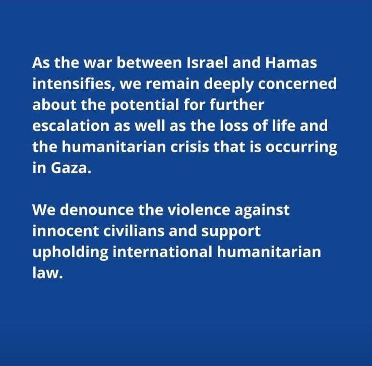 • Com a intensificação da Guerra entre Israel e Hamas, estamos profundamente preocupados quanto ao possível agravamento deste confronto, o que pode causar mais perdas de vidas e exacerbar a crise humanitária em curso na Faixa de Gaza. Nós condenamos a violência contra civis inocentes e apoiamos a defesa do direito humanitário internacional